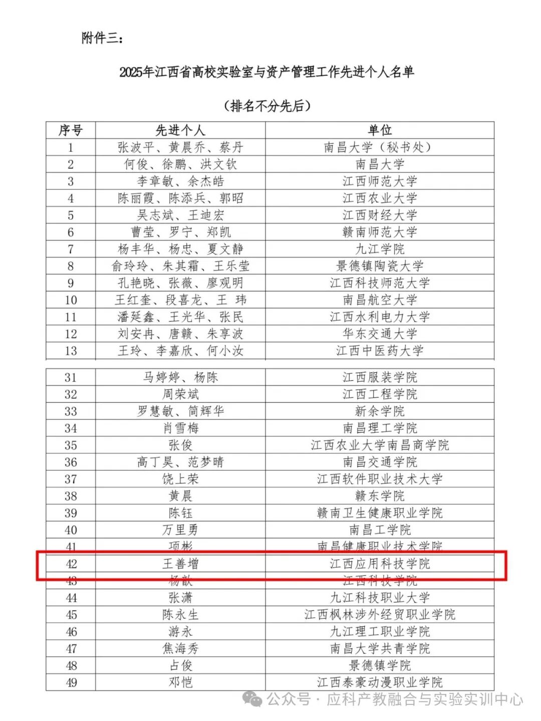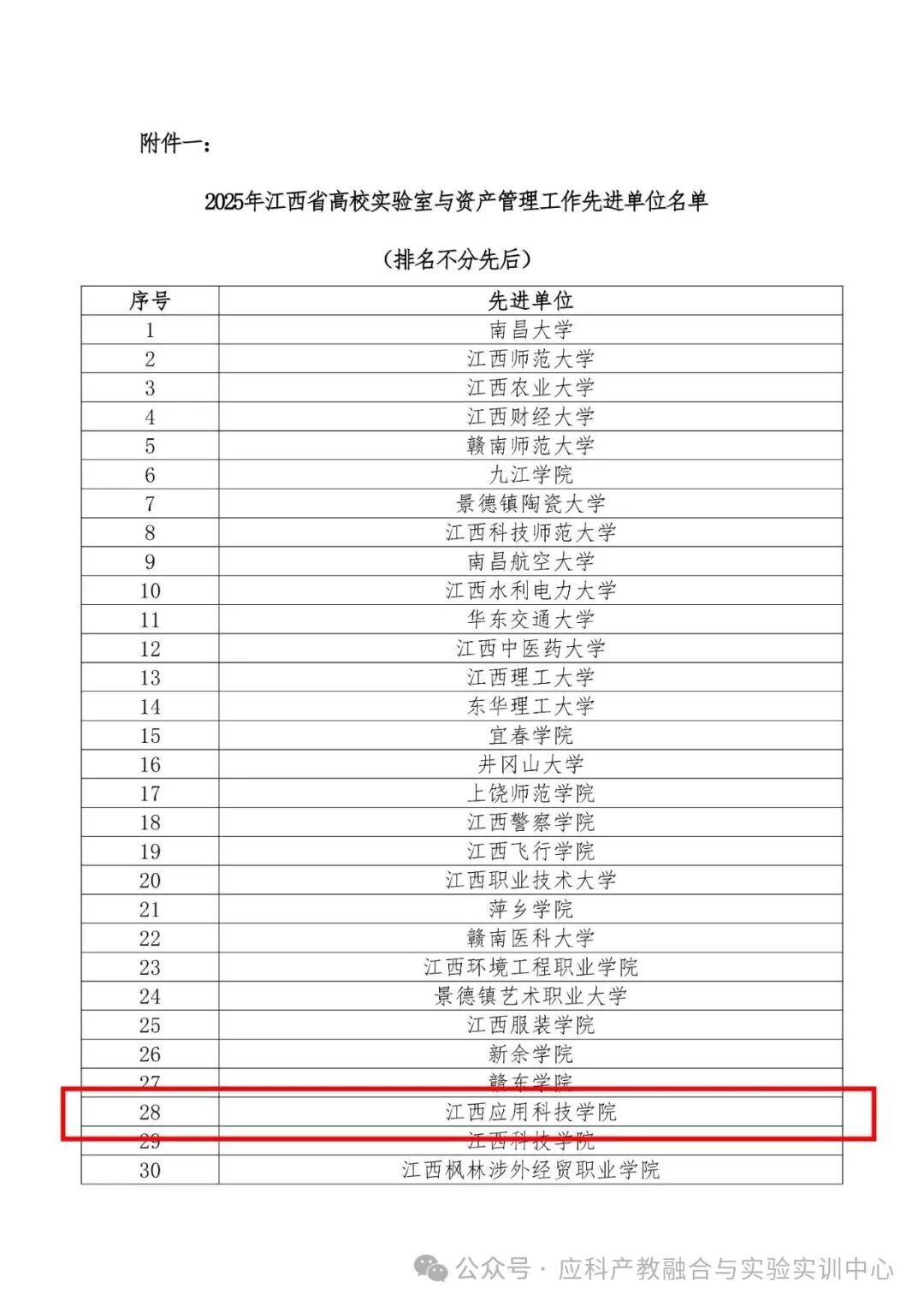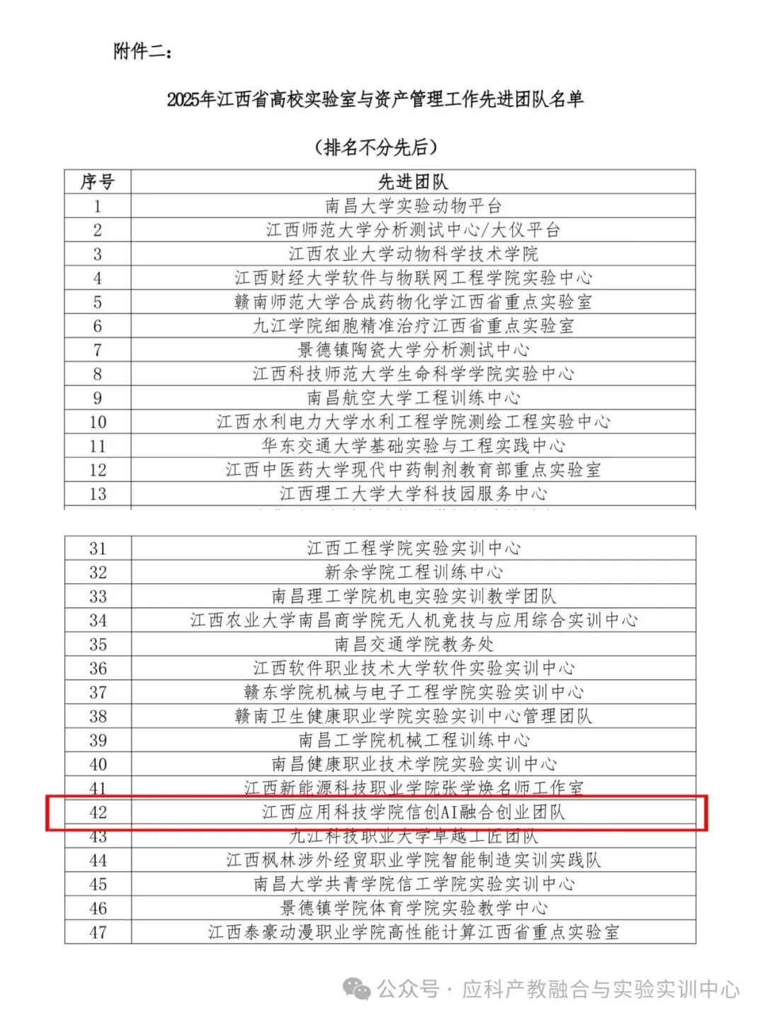 江西省高等教育学会实验室工作分会印发《关于表彰2025年江西省高校实验室与资产管理工作先进单位、团队、个人及突出贡献奖获得者的通知》,我校荣获2025年度“江西省高校实验室与资产管理工作先进单位”,学校信创产业学院信创AI融合创业团队获“江西省高校实验室与资产管理工作先进团队”,智造学院教师王善增获“江西省高校实验室与资产管理工作先进个人”荣誉称号。