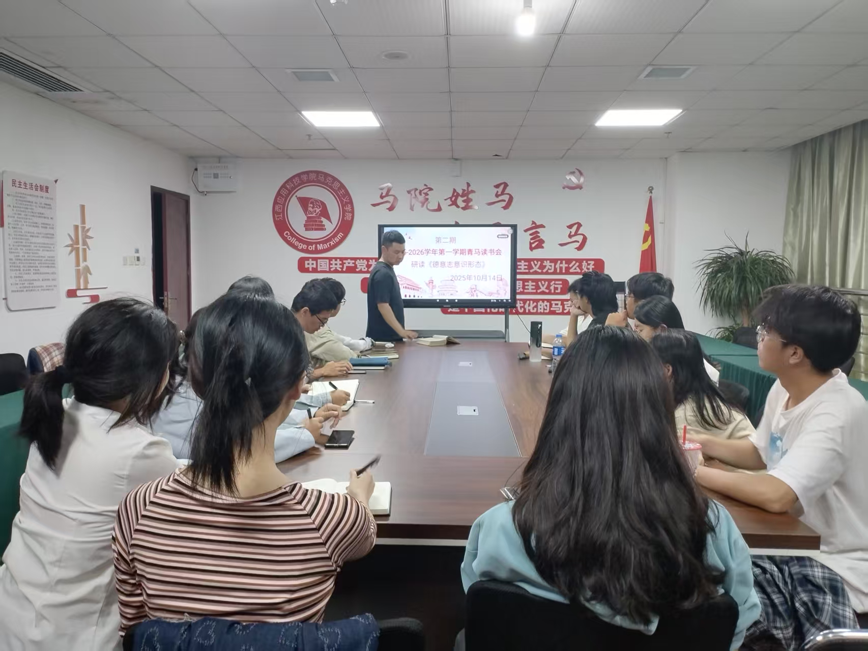 为深化对马克思主义的理解,提升理论素养与思想觉悟,2025年10月14日19:00至21:00,江西应用科技学院青马读书社在综合楼807会议室成功举办了以学习《德意志意识形态》为主题的第二期读书会。本次活动由青马社海小云老师领读,青马读书社全体成员积极参与。
