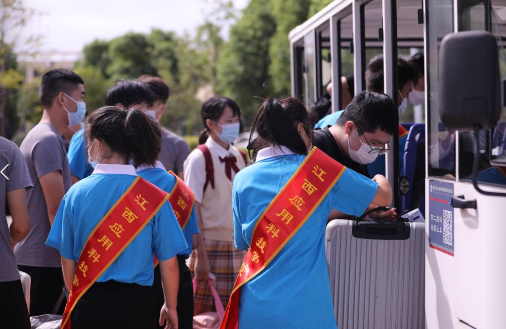 为迎接新生的到来,学校在严格落实疫情防控要求、保障师生健康安全的基础上提供了细致的入学服务。在南昌站及南昌西站等站点分别设立了新生接待处,为到站的新生提供热情指引及帮助。根据疫情防控要求,学校在大门口设立了新生入学通道,通道内分别设置了健康码和核酸报告检查区、测温区和接送区。“同学,麻烦间隔1米排队,戴好口罩”“请打开手机出示健康码和行程码,测量体温。”教官队队员们在通道处不停地忙碌着,负责体温检测、人员指引、协助查验等工作。此外,志愿者团队的身影也活跃在校园各处,他们在道路指引、答疑解惑、行李搬运等方面给予新生热情帮助。