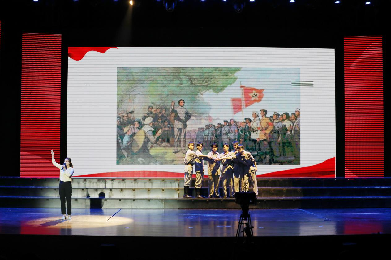 此次思政大课一改以往思政课“老师讲、学生听”的传统模式。课前,学生在老师的指导下策划、编排《风暴》《长征》《三湾改编》等多部舞台情景剧。青年教师通过选题、试课、打磨,最后和同学们一起走上舞台深情演绎。通过老师的讲,学生的演,色彩绚烂的舞台变成了思想政治课的讲台,自编自演情景剧本变成了生动的红色教材,师生同台共同打造了一场生动的“艺术思政课”。