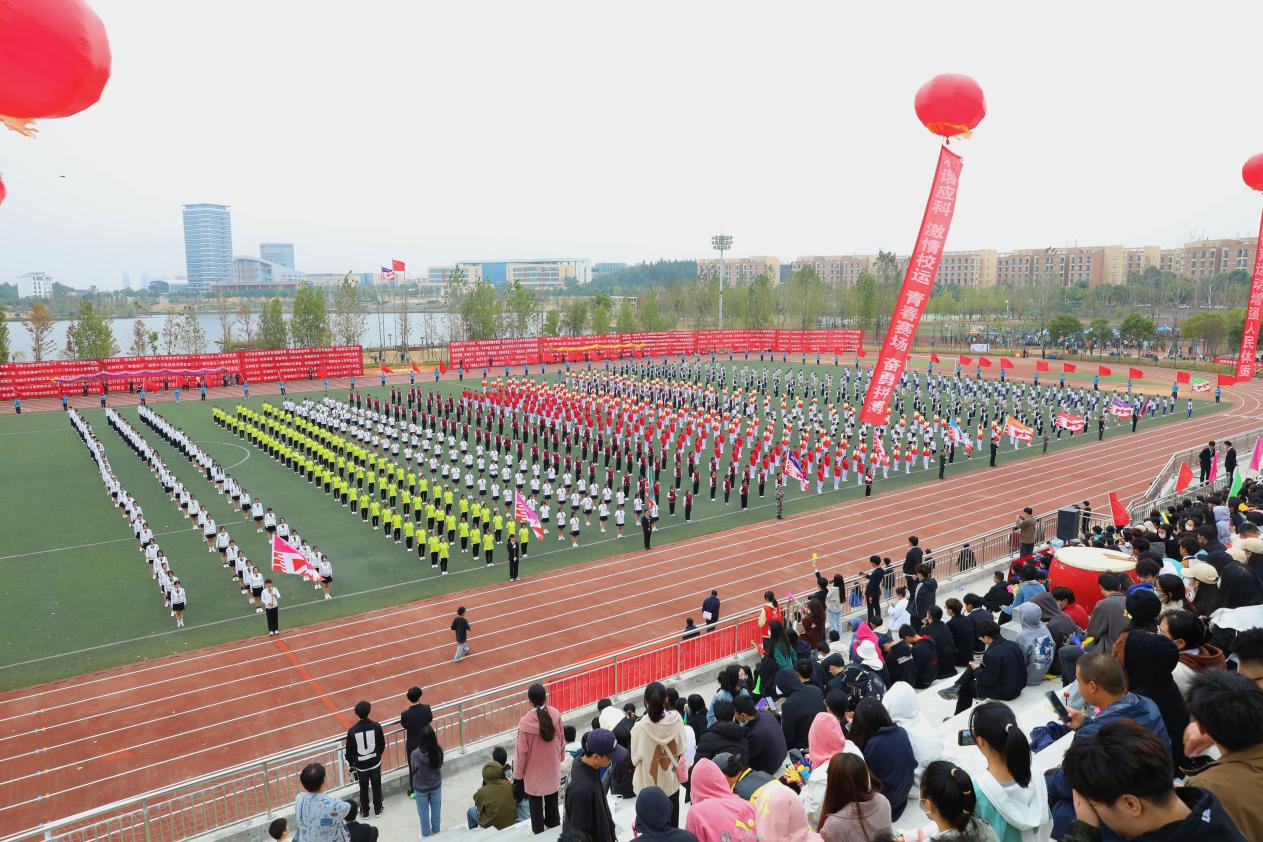 开幕式上,英姿飒爽的国旗校旗会徽仪仗队伴随着慷慨激昂的《运动员进行曲》昂首阔步率先入场,他们满怀热爱与荣光从新征程中走来,动作整齐划一、神情严肃认真,展现出新时代青年的浩然正气。五星红旗在运动场冉冉升起、迎风飘扬,运动员代表和裁判员代表分别宣誓。各学院和机关方阵队喊着响亮的口号,迈着坚定矫健的步伐有序入场,各方阵表演精彩纷呈。现代管理学院的同学们结合自身专业特色融合中国古典舞蹈与现代舞蹈,教育学院的学生们以优美身姿展示古典舞《折枝花满衣》,音乐学院学子百人大型音诗舞情景表演《领航》深情献礼党的二十大。全体运动员参加的广播体操表演,动作整齐划一,身姿优美舒展,充分展现了青年学子昂扬向上的精神风貌。