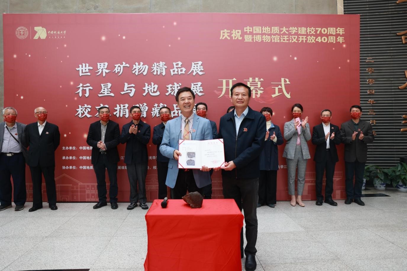 图书档案与文博部部长刘先国接受刘光华捐赠陨石标本,并为刘光华颁发捐赠证书