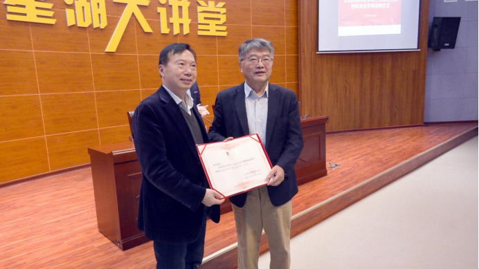 会前,黄士安为陈宪教授颁发创新创业导师聘书。