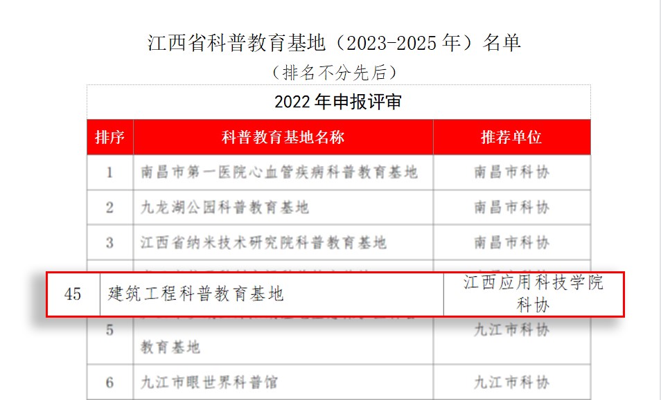 近日,江西省科协公布了2022年江西省科普教育基地名单,江西应用科技学院“建筑工程科普教育基地”经学校科协推荐,省科协组织专家评审、公示后,被授予“江西省科普教育基地”称号。