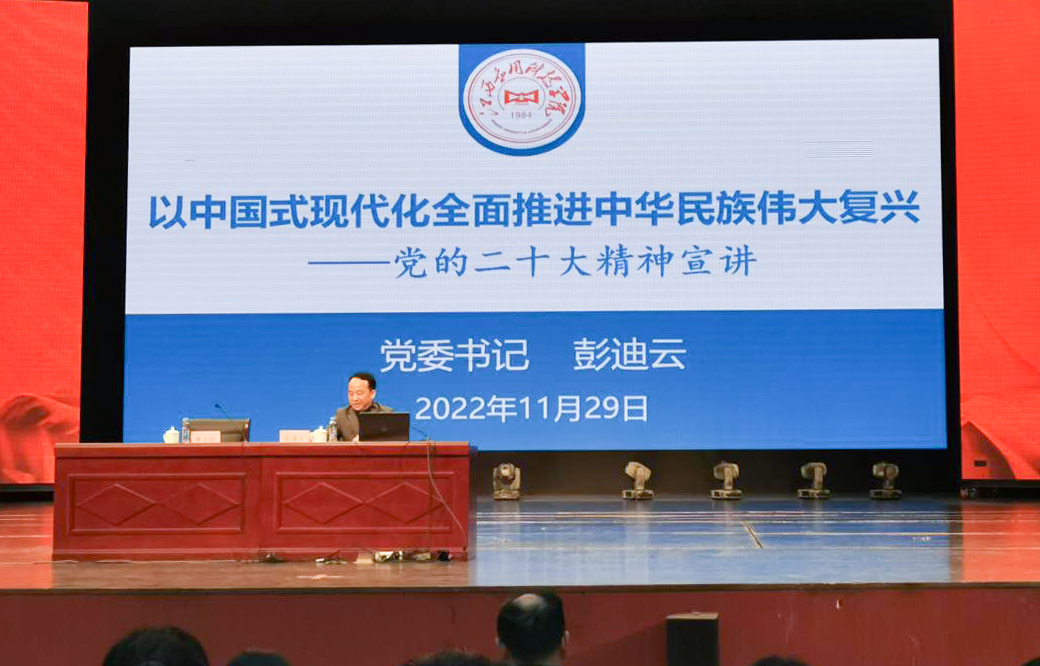 11月29日下午,全省教育系统宣讲团成员、江西应用科技学院党委书记彭迪云在学校音乐厅宣讲党的二十大会议精神。校长黄士安主持宣讲报告会,校领导、中层干部、思政课教师、辅导员教师、教师代表和学生代表等1000余人现场聆听报告。