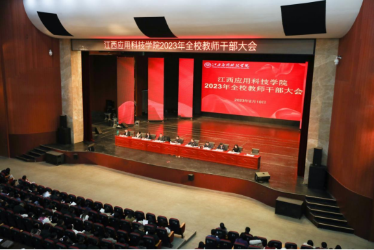 为进一步统一思想、振奋精神,加快推动学校高水平应用型大学建设,2月10日,江西应用科技学院在音乐厅召开2023年全校教师干部大会。学校董事长黄玉林,党委书记彭迪云,校长江作军,常务副校长干甜,党委副书记江星,副校长房小珍、胥懋云、张敏、王立出席会议,学校全体教职工参加了大会,会议由干甜主持。