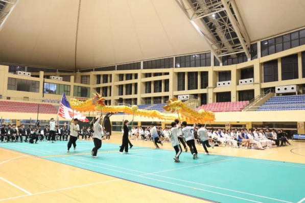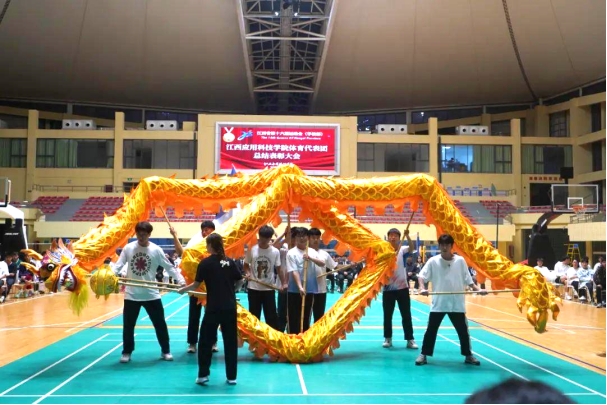 随着江西应用科技学院代表团团旗入场,大会正式拉开序幕。随之而来的是一条金色长龙,它随着代表团旗奔腾至会场,它摆动着身体,翻滚、盘绕、摆尾......各种花样动作,精彩纷呈,体现了应科学子斗志昂扬,乘势而上的良好精神风貌!