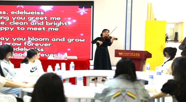 随后,胥懋云、刘光华及外教老师Bonolo共同带领大家演唱英文歌曲《雪绒花》。他们的演唱旋律清新有致,细腻感人,歌声优美而又具有感染力,让同学们感受到了英语的魅力,深深地激发了同学们学习的热情。为了让同学们能够欣赏英文歌曲的美妙旋律,胥懋云为同学们带来了一曲优美的小提琴演奏,此时,英语角的气氛被推向了高潮。