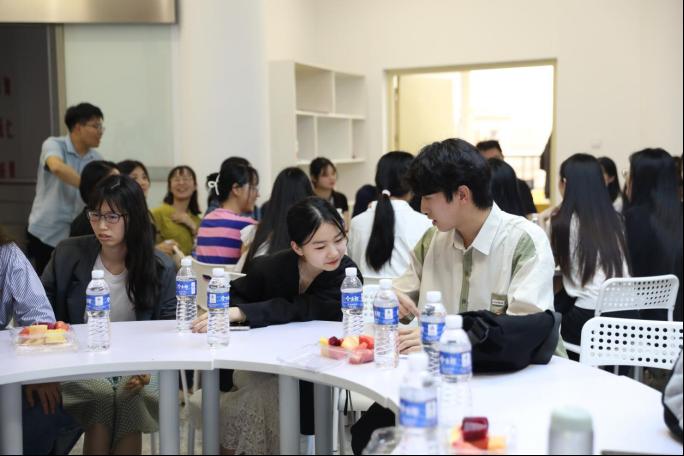 接下来,是本次英语角的主题讨论环节—topic discussion。刘文俊老师用董宇辉、王宝强,赵一曼,梅西四人引出了今天的主题Ambition。刘老师让同学们用英语介绍自己心目中的偶像,并谈谈自己的梦想和追求。围绕这个主题,各位同学们都积极发言,现场的英语氛围十分活跃。两位英语外教也阐述了自己的想法,他们与同学们进行互动,讨论交流,给各位同学们带来了属于他们自己的故事。