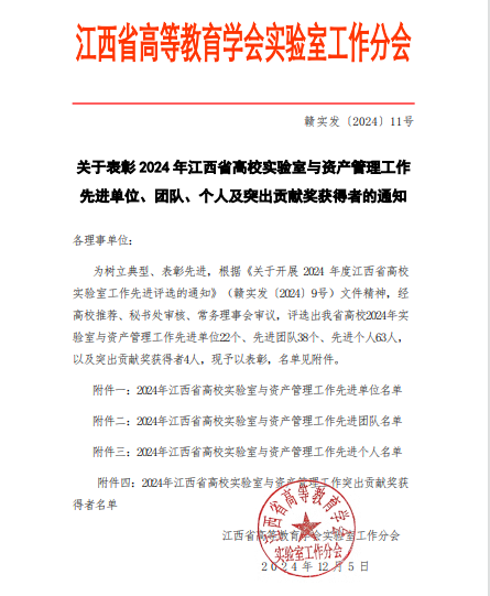 12月5日,江西省高等教育学会实验室工作分会印发《关于表彰 2024 年江西省高校实验室与资产管理工作先进单位、团队、个人及突出贡献奖获得者的通知》赣实发(〔2024〕11 号),评选确定了38个先进团队、63位先进个人。我校智造学院南昌市激光加工制造及材料改性重点实验室荣获“先进团队”荣誉称号。除此之外,我校教师徐燕兰获评“先进个人”荣誉称号。