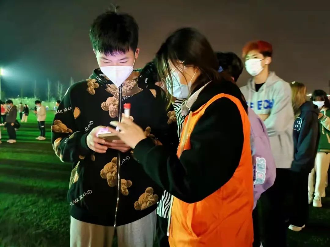 下午6时,学生集合。同学们以班为单位,由各二级学院带队,佩戴口罩,提前在等候区等待,在志愿者的指引下保持间隔一米的安全距离,有序地进入检测场地。