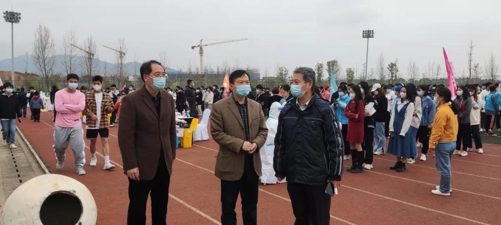 本网讯(记者团记者/卢思函、陈美玲 摄影/严远磊)3月19日下午,江西应用科技学院在前一天核酸检测全部阴性的情况下开展了第二轮全员核酸检测工作。26个检测点、近百名机关党员干部、200余名学生志愿者……全校师生员工迅速集结,快速有序地完成核酸检测,以实际行动展现了“应科速度”和“应科力量”。董事长黄玉林,校长黄士安,党委副书记邓海平,副校长李建萍、胥懋云、刘春斌、张敏等校领导带队到现场检查指导工作。
