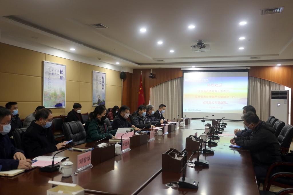 本网讯(记者/刘金 摄影/黄愈)3月22日,江西省委教育工委委员、江西省教育厅副厅长裴鸿卫,江西省教育厅职成处主任姚庆云来我校视察指导防疫工作。我校在图书馆四楼会议室召开座谈会,学校董事长黄玉林,校长黄士安,常务副校长干甜,党委副书记邓海平,副校长李建萍、刘春斌、张敏出席会议。黄士安主持会议。