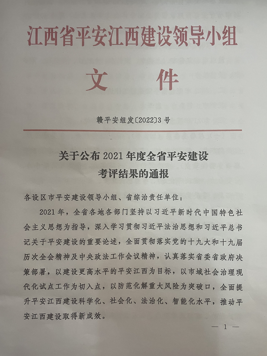 近日,江西省平安江西建设领导小组印发《关于公布2021年度全省平安建设考评考评结果的通报》,我校被授予“2021年度全省平安建设工作先进单位”。