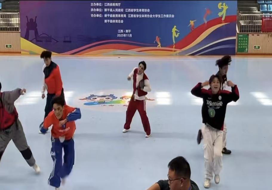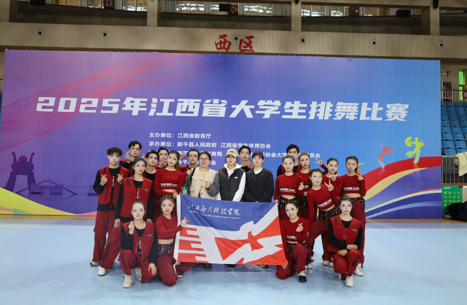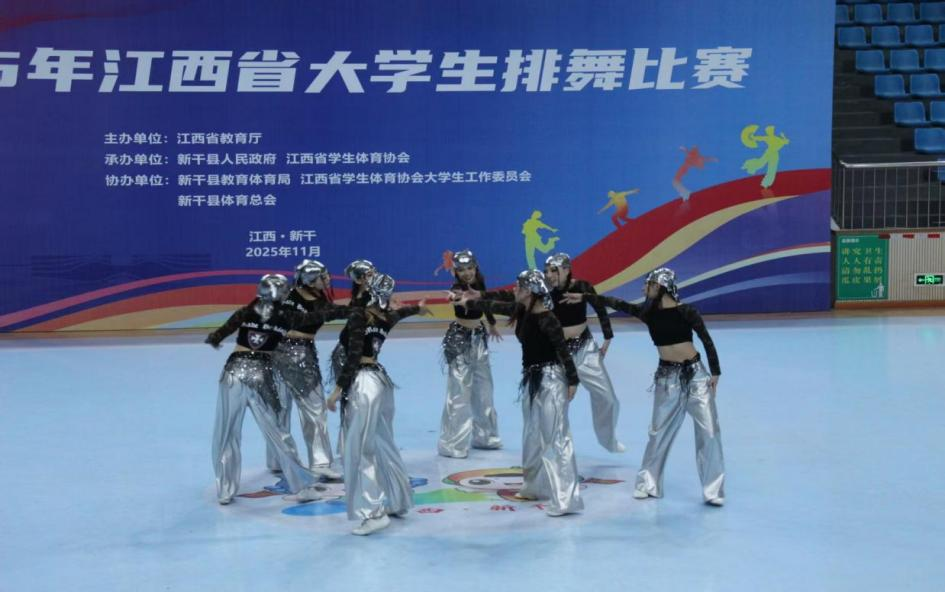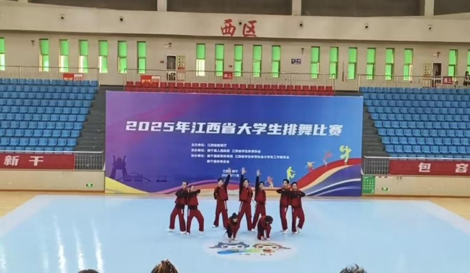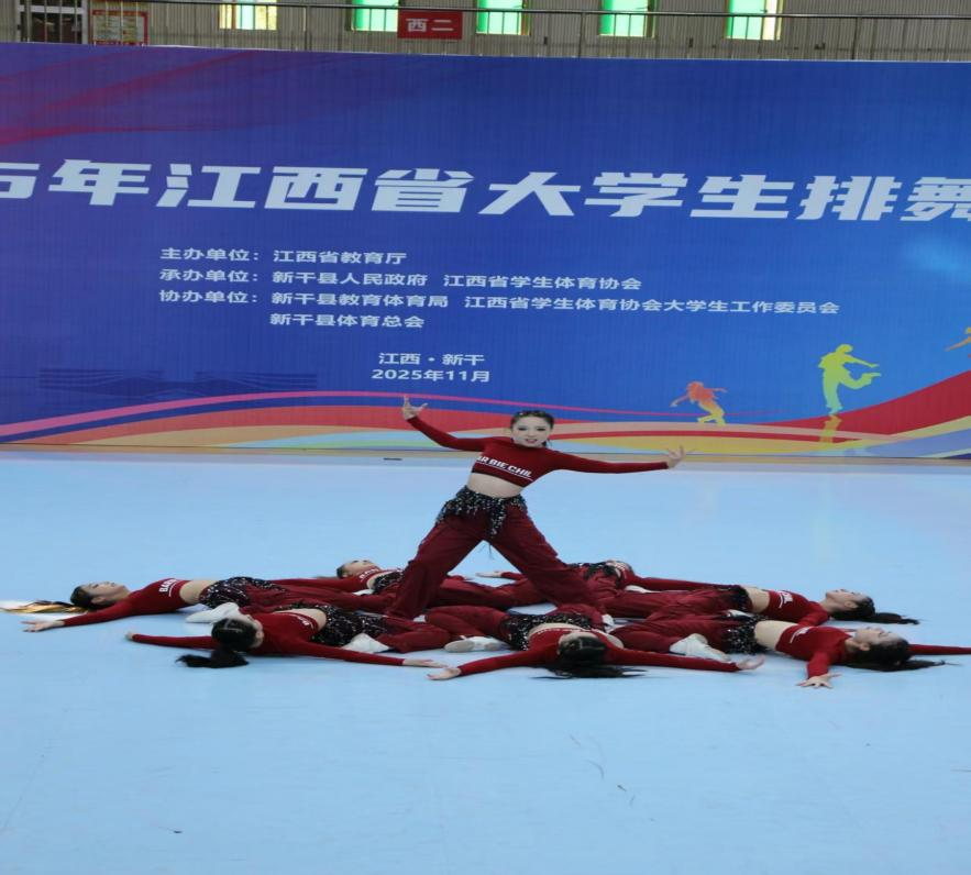 2025年11月23日至26日,由江西省教育厅主办、江西省学生体育协会承办的2025年江西省大学生排舞比赛在吉安市新干县隆重举行。我院排舞队在学院党总支副书记贾鹏军的带领下,在刘玉兰、夏花、朱荥荥、赵子龙四位老师的指导下,在多个项目中取得优异成绩。