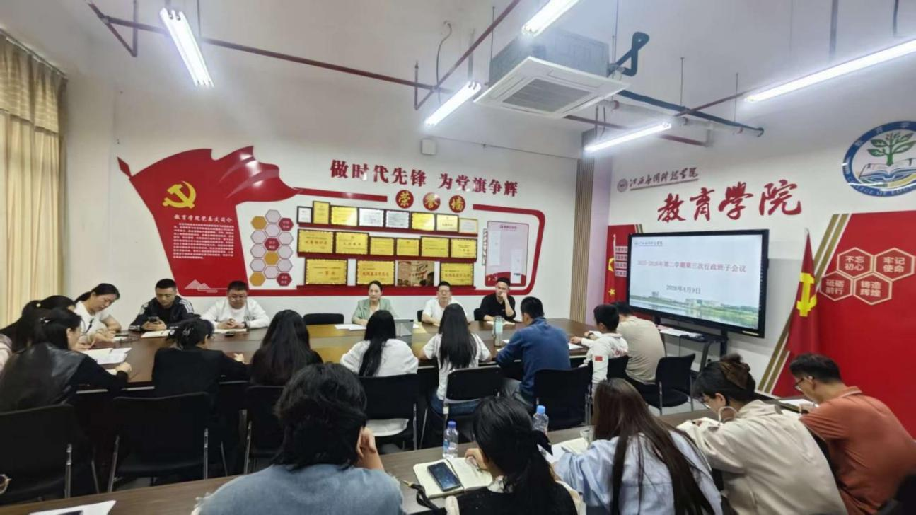 2026年4月9日,教育学院在党员活动室召开2025-2026学年春季学期第三次行政班子会议,会议由院长罗明丽主持,学院领导班子、各教研室正副主任、学工科、教务科及办公室全体行政人员以线上线下结合方式参会,会议围绕2026届毕业生关键工作与学院近期重点任务进行集中研讨、逐项部署。