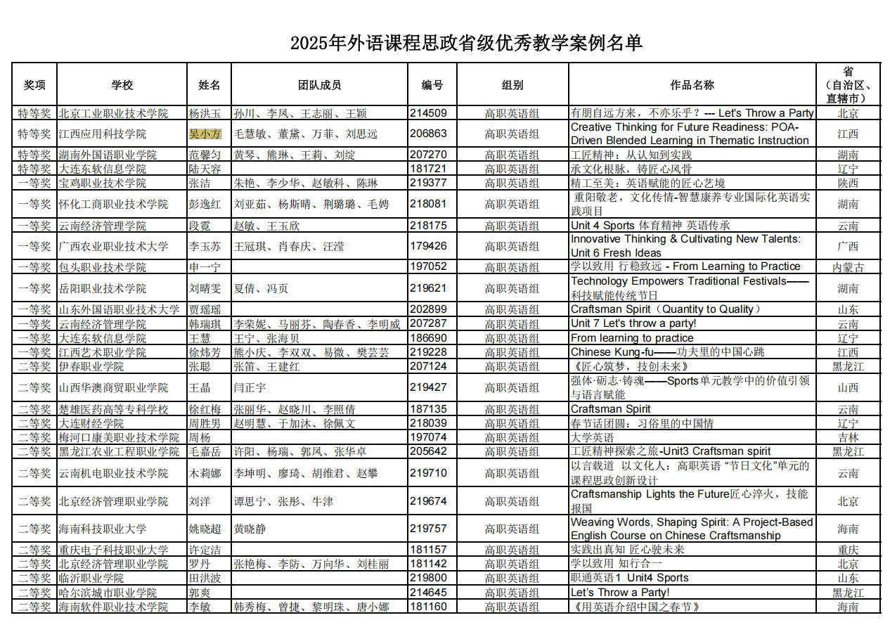 竞赛以“课程思政”为核心导向,强调在外语教学中有机融入思想政治教育元素,实现价值塑造、知识传授与能力培养的多元统一。经严格评审,最终评选出一批优秀教学案例。其中,公共教学部的吴小方团队荣获高职英语组一等奖,潘婷团队斩获本科大学英语组一等奖。在后续的省级评选中,吴小方团队再获高职英语组特等奖,潘婷团队获得本科大学英语组二等奖,成绩斐然。