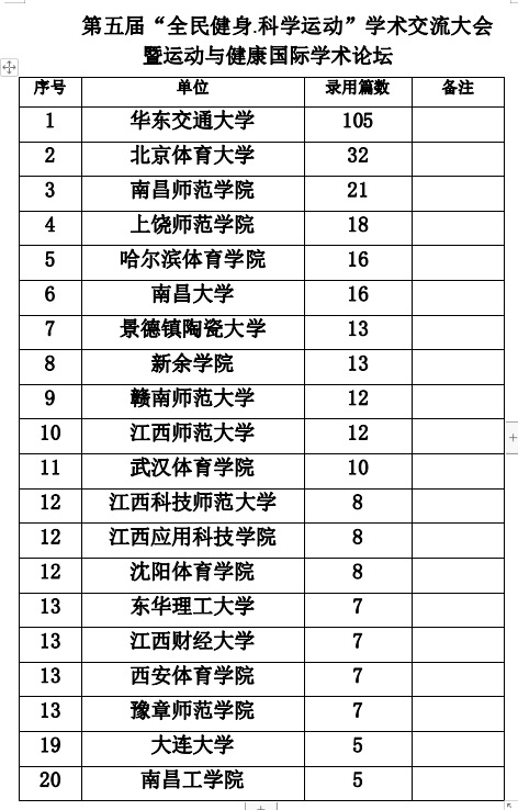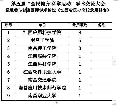 大会以“体卫融合”“青少年体质健康”等12个主题为核心,共录用国内外学术论文479篇,全面展现了全民健身与科学运动领域的前沿动态与研究进展。我校教师积极参与,共投稿11篇,其中8篇被录用,录用率位列江西省民办高校首位,与江西科技师范大学、沈阳体育学院等高校并列总排名第12位,体现出较强的学科科研实力。