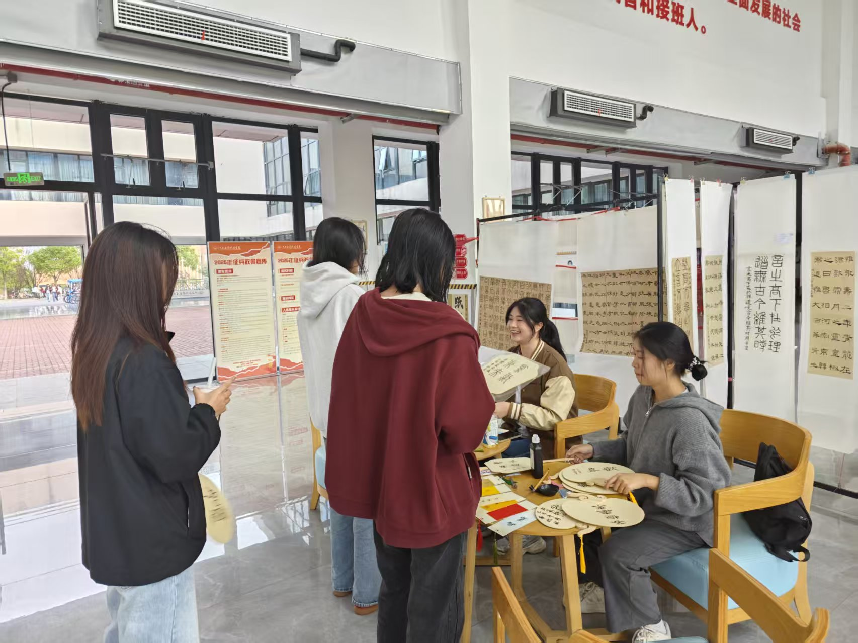 同学们的作品风格多元、各具特色。篆书端庄有力,隶书流畅舒展。每幅作品均体现了学生对书法艺术的热爱与探索,展现了青春气息与文化积淀。11月11日至12日下午,展览特别设置互动体验环节,周卓灵、饶诗童、龙学颖、黄希珍、朱惠芳五位同学化身“文化使者”,为到场观众赠送手书纸扇与书签,让书法艺术融入日常生活,受到广泛欢迎。