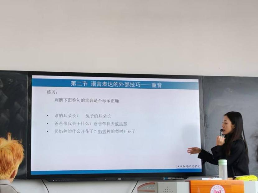 课堂伊始,温可馨老师解析幼儿故事讲述中四类常见重音形式时,巧妙融入思政引导。课程巧妙将思政元素融入重音教学环节,引导学生思考重音在传递“勇敢”“节俭”等价值观中的作用;在情境演绎点评中,强调“幼儿教师的重音运用不仅是专业技能,更是对幼儿价值观的正向引导”,助力学生深化“以美育人、以文化人”的教学认知。在“重音标示判断”练习环节,温可馨老师结合题目强调,“作为未来的幼儿教师,准确的重音不仅是专业能力,更是对幼儿价值观的正向引导,每一次语音的强调都可能在幼儿心中种下一颗善的种子。”
