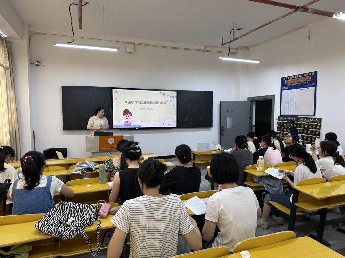 课堂伊始,徐莉莉老师以某社区“亲子自然探索营”的真实案例为切入点,通过视频展示、数据分享,引导学生分析社区教育资源的类型、优势及开发难点,帮助学生建立对“社区教育资源”的系统认知。随后,她将学生分为4个小组,设置“模拟社区教育活动策划”任务——要求各组结合不同社区特点,设计适合 3-6岁儿童的社区教育活动方案,并阐述资源整合思路与实施步骤。在小组研讨过程中,徐莉莉老师深入各小组,进行针对性指导,鼓励学生结合学前儿童发展特点创新活动形式。徐莉莉老师结合当前社区学前教育的实际案例与政策要求,采用 “案例解析 + 小组研讨 + 模拟实践” 的多元教学方法,让课堂既有理论深度,又具有实践指导性。
