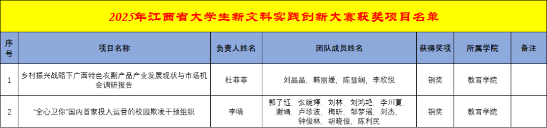 大赛自启动以来,一经推出便受到全省的广泛关注,来自全省38所本科高校的近万名学生报名参赛,参赛项目1147项。经校级初赛、全省决赛网评赛的激烈角逐,27所高校的161个项目脱颖而出,晋级决赛现场赛。经过现场激烈角逐和大赛组委会严格审核,教育学院入围决赛现场赛的2个项目获得优异成绩,《乡村振兴战略下广西特色农副产品产业发展现状与市场机会调研报告》《“全心卫你”—国内首家投入运营的校园欺凌干预组织》荣获铜奖。