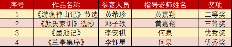 近日,由教育部和国家语委共同主办的第七届中华经典诵写讲大赛全国总决赛获奖名单正式公布。学院教师黄嘉翔老师指导的黄希珍同学,其硬笔作品《游褒禅山记》节选荣获“笔墨中国”汉字书写大赛硬笔大学生组二等奖、邓子轶同学的硬笔作品《颜氏家训》选抄荣获“笔墨中国”汉字书写大赛硬笔大学生组三等奖,何泉老师指导的李安祺、李钰星同学,分别书写的硬笔作品《墨池记》《兰亭集序》,均获该大赛硬笔大学生组优秀奖。