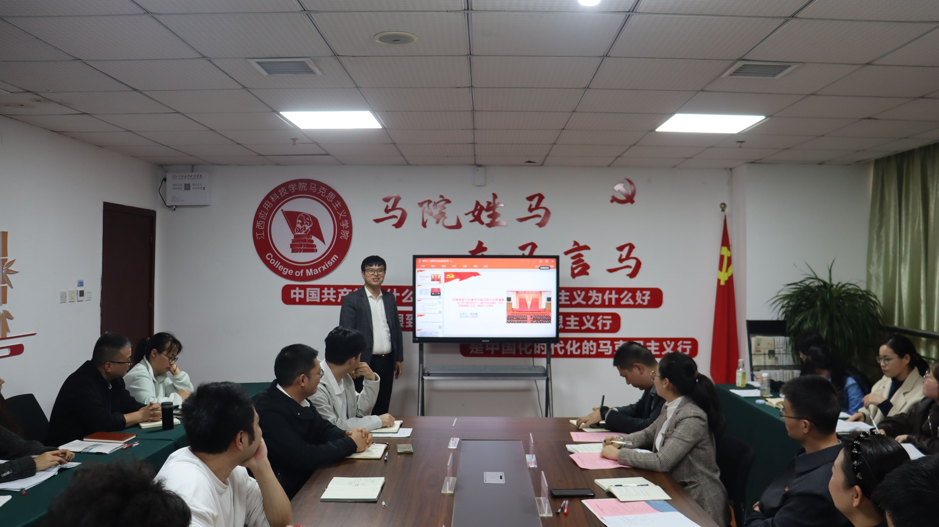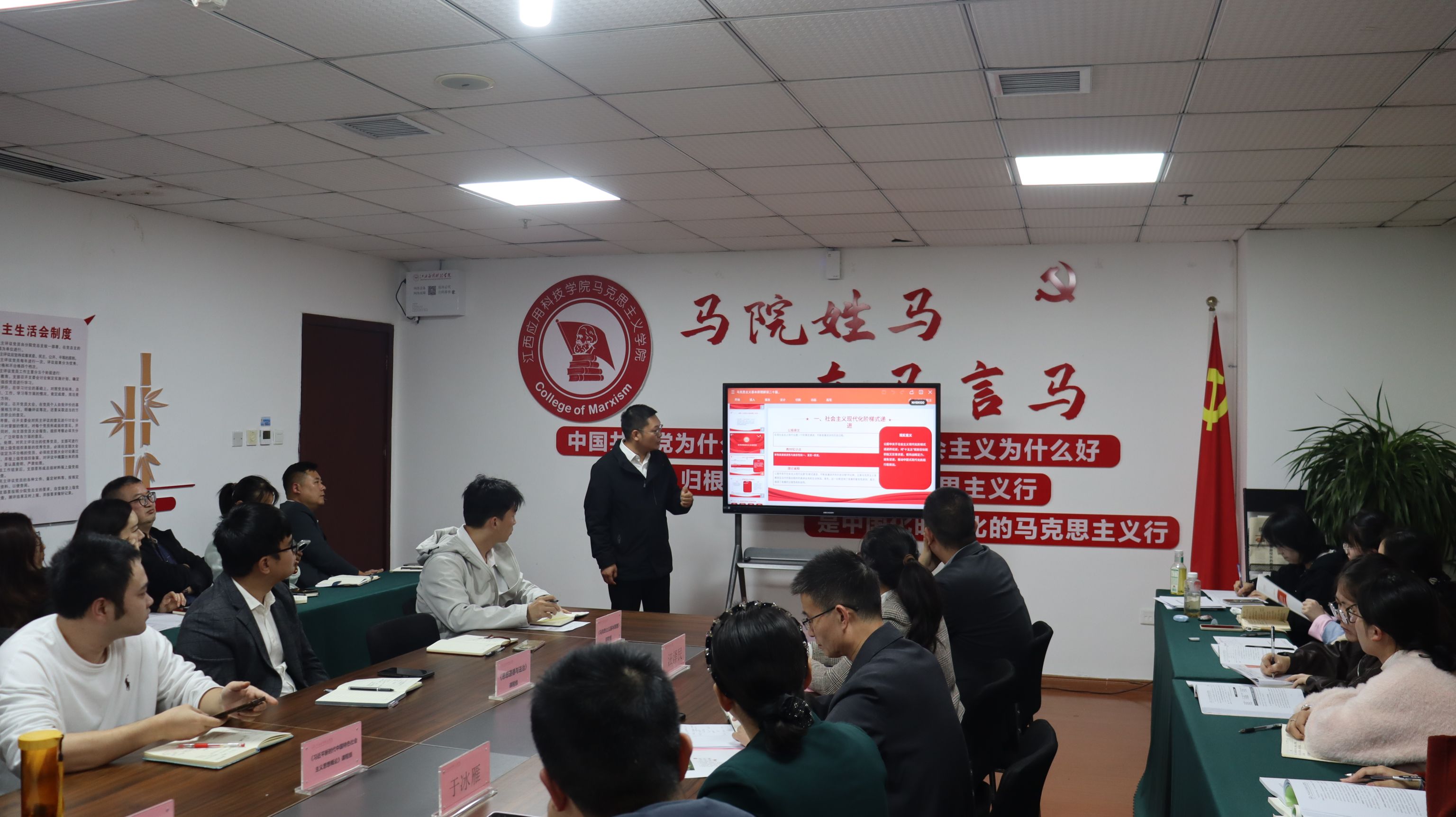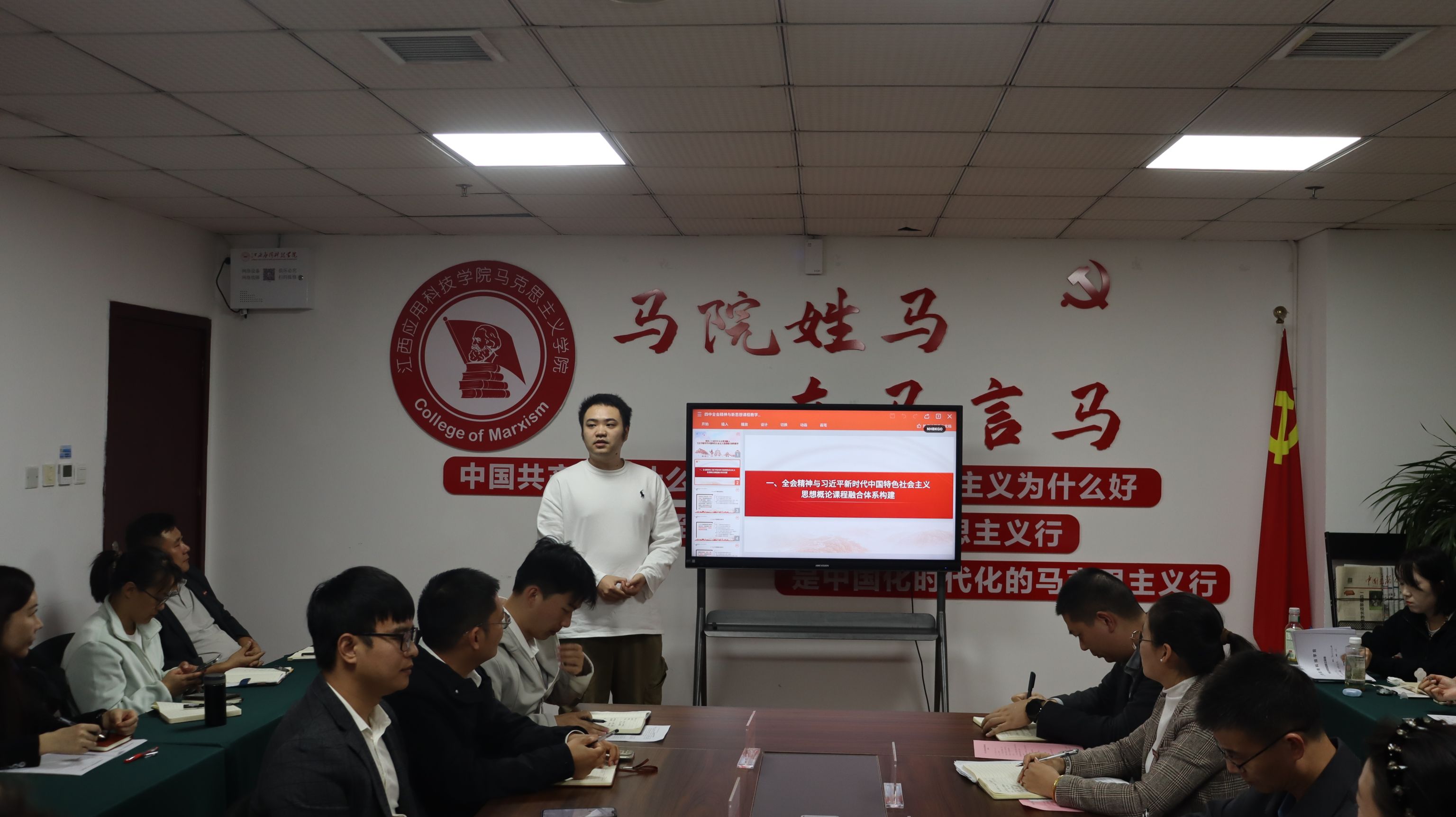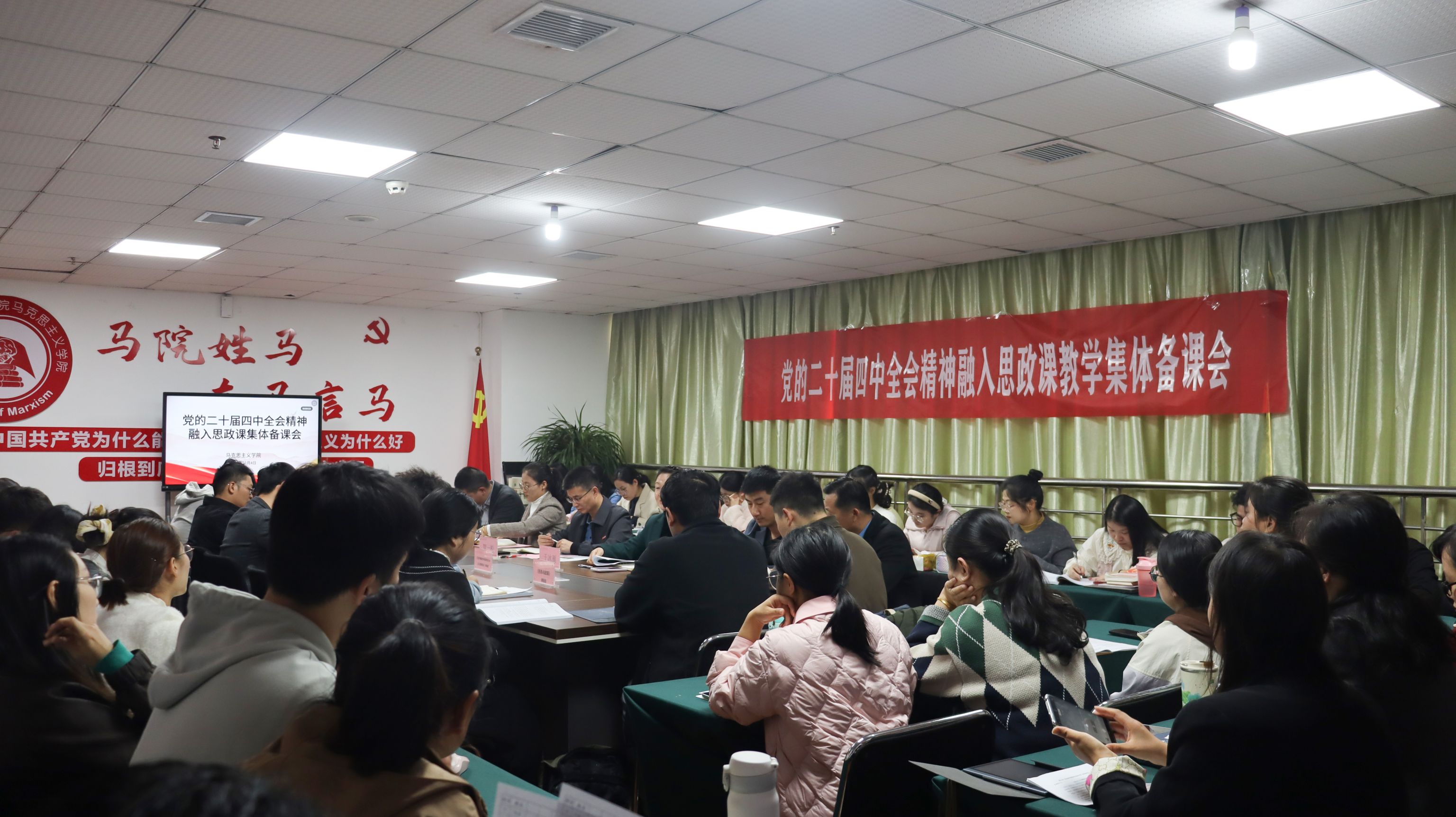 马克思主义学院院长于冰雁围绕党的二十届四中全会提出的“六大原则、七方面目标、十二项重要部署”,结合《2025-2026学年高校思政课堂教学提升行动的通知》要求,作了系统解读与教学融入辅导,强调全体思政课教师要以高度的政治自觉推动全会精神与教学实践深度融合,切实提升课堂教学质量。各课程组围绕“党的二十届四中全会精神有机融入教学”这一核心议题进行了深入交流与集中研讨。各课程组聚焦“党的二十届四中全会精神有机融入教学”展开深入研讨,系统梳理了全会公报要点与各门课程内容的对应关系,从理论逻辑、内容阐释与实践路径等多个维度,探索全会精神与思政课程体系的有机结合点,并就教学重点与融入方式凝聚了共识。