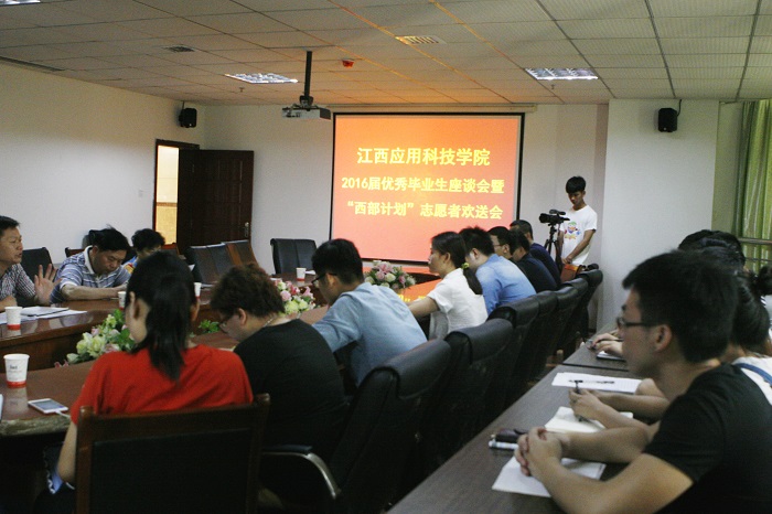 本网讯(记者/谭亚玲 摄影/黄愈)6月28日上午,我校在综合大楼六楼会议室召开2016届优秀毕业生座谈会暨“西部计划”志愿者欢送会,副校长徐国荣、黄珍珍、吴朝栋等相关领导及各分院党总支书记出席本次座谈会,会议由校长助理章斌主持,我校6名“西部计划”志愿者和19名优秀毕业生代表参会。