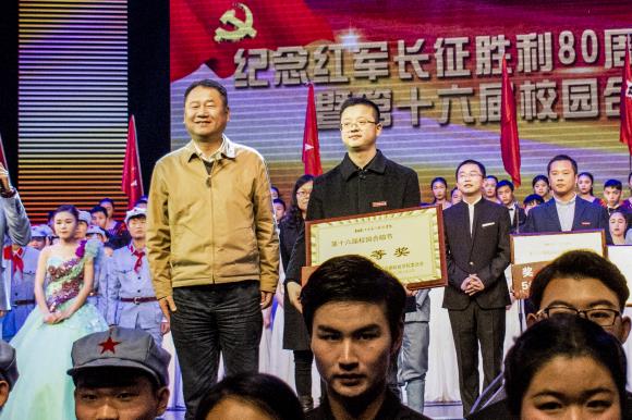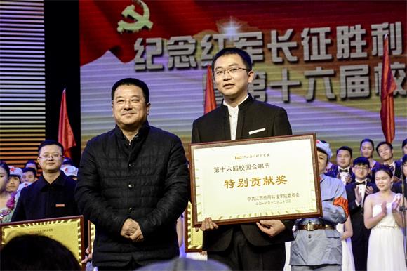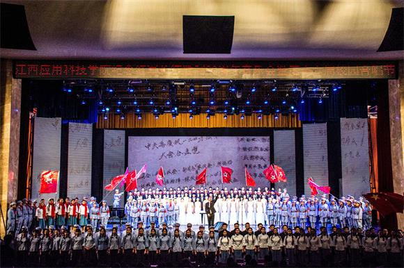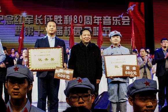 黄玉林在为音乐学院颁发特别贡献奖后发表讲话,他说,今天的活动我同样也是个受教育者,我也同样感到非常震撼,我们学校一直以来特别重视德智体美全方位发展,不仅在教育教学过程当中给同学们以知识,还要给同学们以健康的欣赏及健康的体魄,长期的文化浸润就像空气中的水分子一样,在影响着我们每一个学生的进步成长,长征精神是我们核心价值观的重要体现之一,是我们年轻人在成长发展过程当中最重要的精神食粮。我相信,这种坚贞不屈、勇往直前、不达目的、直向胜利进军的长征精神将同样根植于我们江西应用科技学院的办学追求当中,像我们的誓言一样,百舸争流,我们永争第一;百舸争流,我们只争第一。