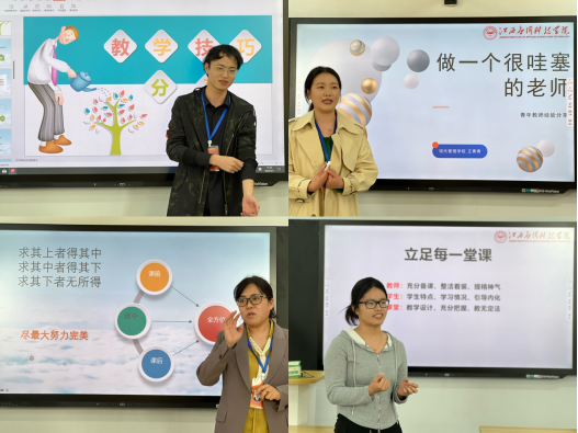 随后,四位优秀青年教师进行分享授课技巧,王青青老师提出了高效备课、高效课堂的重要性;周宇翔老师认为在课堂教学中的情感交流是实现其教学目标的长效催化剂,也是保证教学目标能够得到认同的基础;孙成霞老师分别从课前、课中、课后三部分七个方面分享了上课的技巧;陈晶晶老师说到教无定法,每一位老师都要做到充分把握课堂。