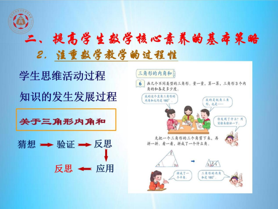 黄俊辉老师分别从核心素养与数学核心素养、提高学生数学核心素养的基本策略、核心素养背景下的数学课堂教学实施三个方面进行授课。他讲到“核心素养”是学生在接受相应学段的教育过程中,逐步形成的适应个人发展和社会发展需要的必备品格和关键能力,既包括跨学科核心素养,又包括学科核心素养;数学核心素养是学生在接受相应学段的教育过程中,逐步形成的适应个人终身发展和社会发展需要的人的、具有数学特征的思维品质与关键能力,包括数学抽象、逻辑推理、数学建模、直观想象、数学运算、数据分析等,目标是用数学的眼光观察世界、用数学的思维思考世界、用数学的语言表达现实世界。