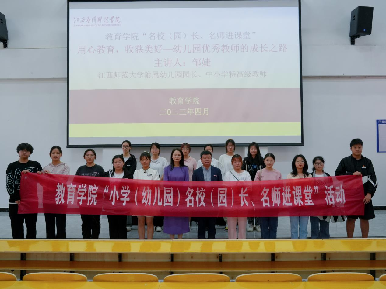 为了进一步密切学院与小学(幼儿园)的交流和沟通,深化“院-园、院-校”协同育人机制,发挥名校(园)长、名师及其团队的教学引领、指导、辐射作用,强化学院师生对基层小学(幼儿园)师资需求和课堂教学改革的清醒认识,加深学生对小学(幼儿园)教师专业知识、专业技能和教育情怀的认识和理解,提升学生的责任意识和专业使命感,教育学院筹划举办“小学(幼儿园)名校(园)长、名师进课堂”活动。4月16日学院邀请江西师范大学附属幼儿园园长、小学特高级教师、江西省第一批学前教育质量提升计划领航者、江西省幼儿园园长研究会理事邹婕老师在志远楼101教室为学院2020、2021、2022级学前教育专业讲授《用心教育,收获美好—幼儿园优秀教师成长之路》课程,学院院长郑昌保主持课程。
