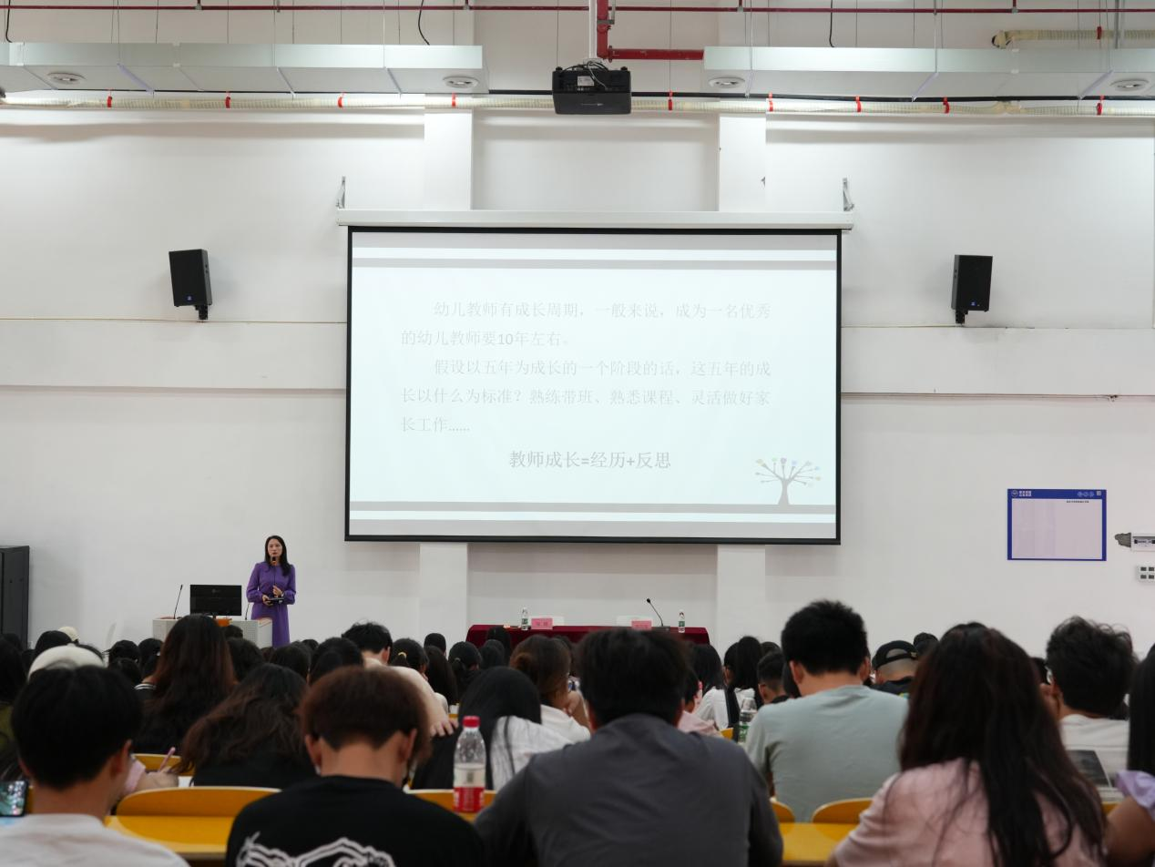 讲座深入浅出,图文并茂,声像俱存,灵活生动,运用了诸多师大附属幼儿园老师们在日常的教学中的实践经验和课程案例、各种富有哲理的金句,以及邹园长对幼教事业的执着与热爱,对孩子的爱心和责任心深深地打动了在场所有学生,现场时不时响起热烈的掌声。让学生们深深地感受到身为一名学前教育专业大学生对未来成为一名幼儿教师的使命感和责任感。