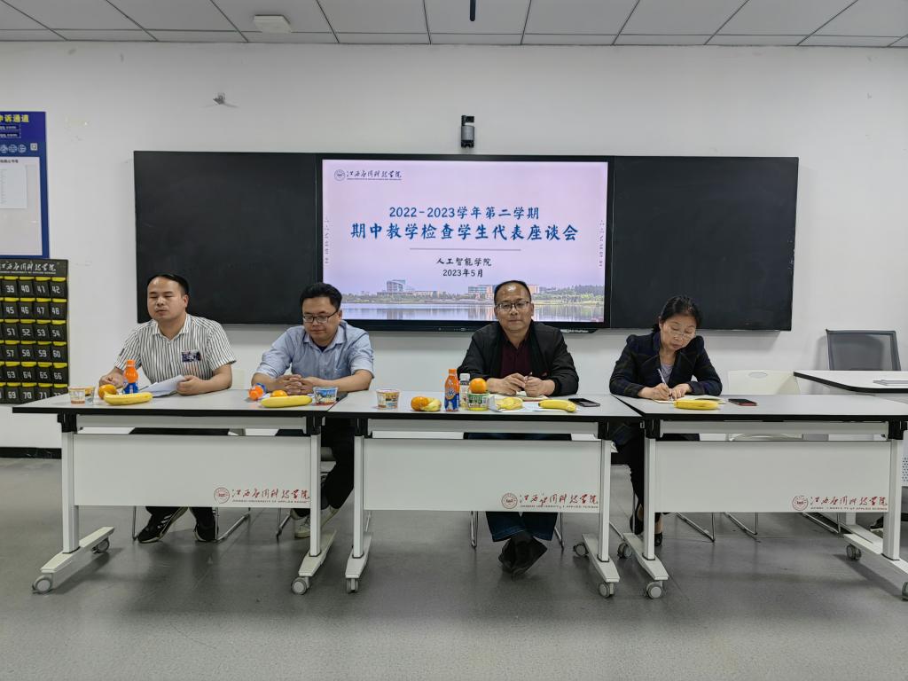 为了落实学校2022-2023学年第二学期期中教学检查的通知精神,规范教学管理、提升师生满意度、提升教学质量,人工智能学院于2023年5月9日下午在三达楼410教室召开2022-2023学年第二学期期中教学检查学生代表座谈会,人工智能学院院长李俊、副院长刘晔、副院长邓春华、学院学生代表、教务科全体成员参加此次会议,会议由教务科科长张召志主持。