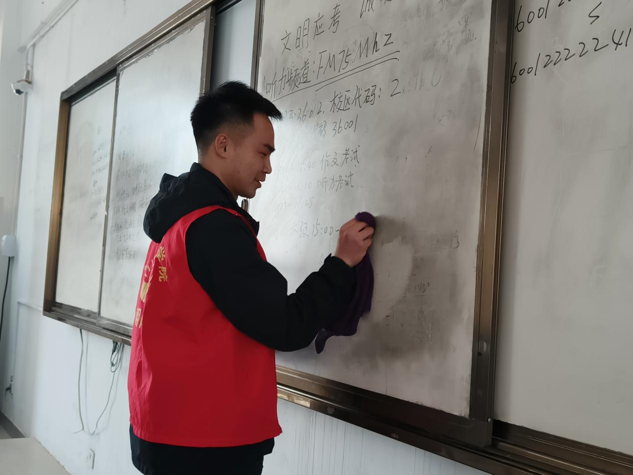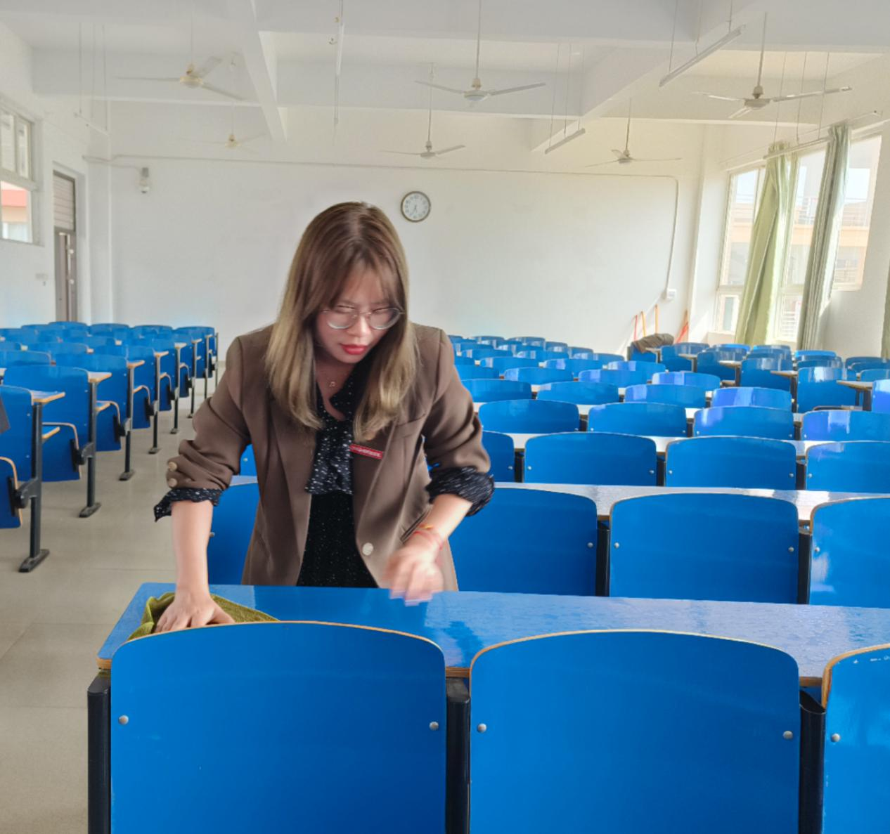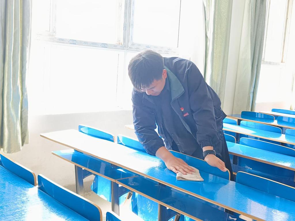 党员同志们撸起袖子,为毕业生们打扫地面、擦拭窗台、开窗通风、收拾垃圾、酒精擦拭黑板、擦门、拖地,清扫每个角落的灰尘,进行无死角的杀菌消毒,大家分工有序,有条不紊地穿梭在各教室间,让教室焕然一新,一举一动都充满着分院对学生们归来的期待。