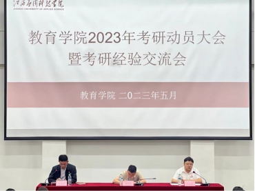 为激发学生考研热情,增强考研信心,提升考研竞争力,5月8日,教育学院2023年考研动员大会暨考研经验交流会在志远楼101报告厅召开。教育学院院长郑昌保、党总支书记宋春雷出席会议,学院全体辅导员、2019级考研学生代表和2020级全体学生参加了会议。会议由学工科科长张伟健主持。