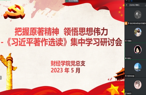 为深入开展学习贯彻习近平新时代中国特色社会主义思想主题教育的指示精神和要求,5月30日下午,财经学院党总支于综合大楼211党员活动室结合腾讯会议,开展学习“把握原著精神,领悟思想伟力”—《习近平著作选读》集中学习研讨会。参加此次会议的有校党委委员、副校长胥懋云、财经学院党总支书记何难绝、财经学院院长揭志锋以及财经学院全体师生党员。