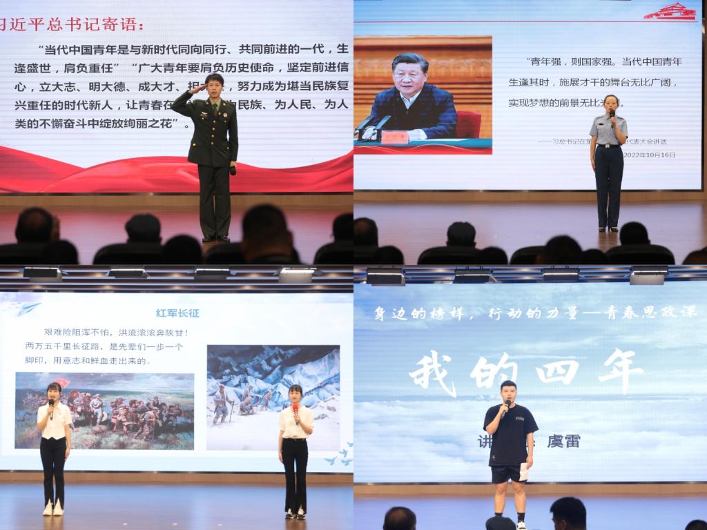 “笃行-青春正当时”课时中,首先由退役军人黄浩斌、陈婷分别以“生命中的一抹迷彩绿”“二展巾帼志 青春正当时”为主题,为大家讲述了他们“不负时代不负韶华,为强国建设贡献力量”的军旅生活以及退役复学后仍不改军人本色,勇担责任、冲锋在前的校园生活。随后,学校优秀学生代表杨佳佳、杨乐乐以“无悔青春,追梦星河”为主题,同大家分享了她们信念如磐,赓续红色血脉的“再走红军长征小道”之行。优秀学生代表虞雷则是通过回顾他的大学四年点滴,向在场的听众们分享了他考取复旦大学的考研心路历程,希望通过分享自己的经历,鼓励同龄人,也让自己更加全面地思考问题,认识自我。
