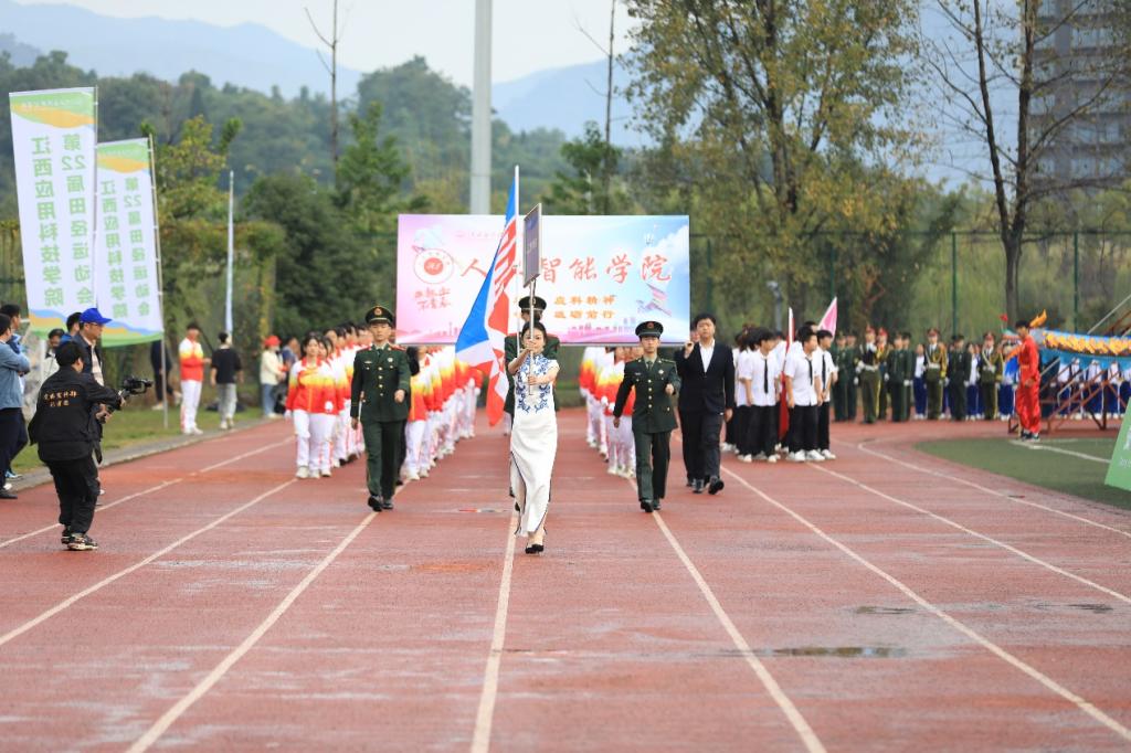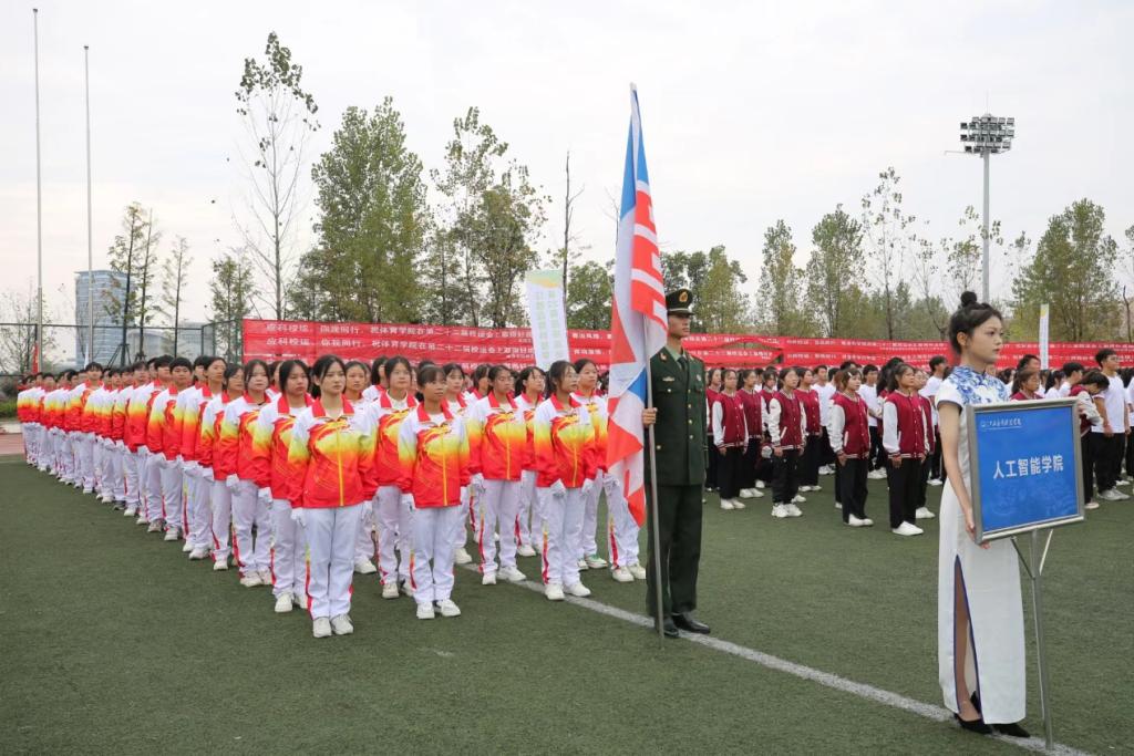 随着音乐声的响起,现在向我们走来的是人工智能学院代表队,方阵的每个成员都昂首挺胸、精神抖擞,迈着自信的步伐向前。