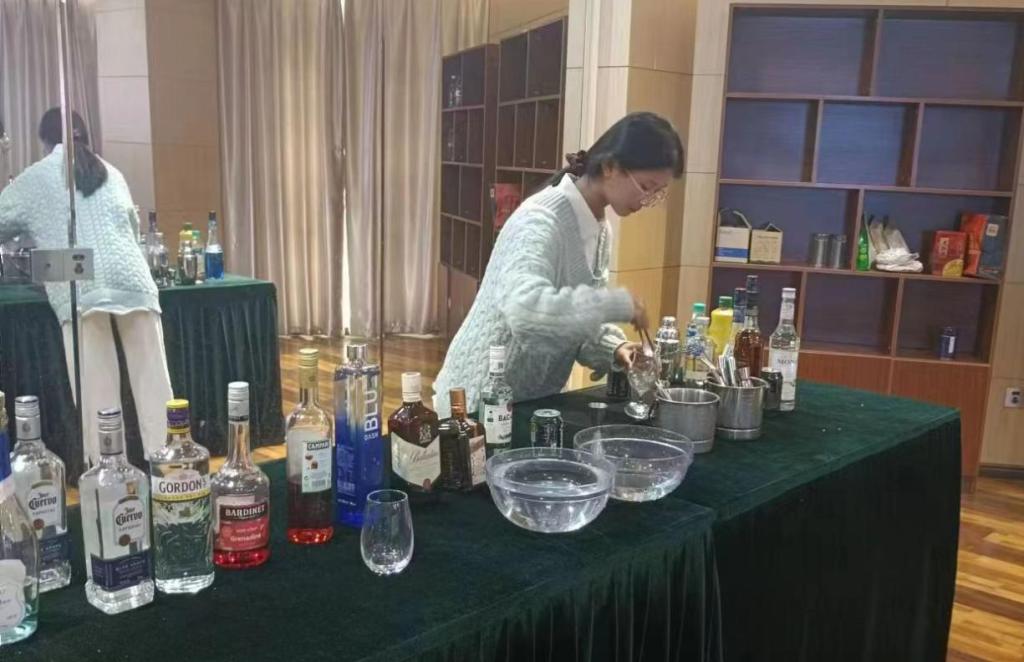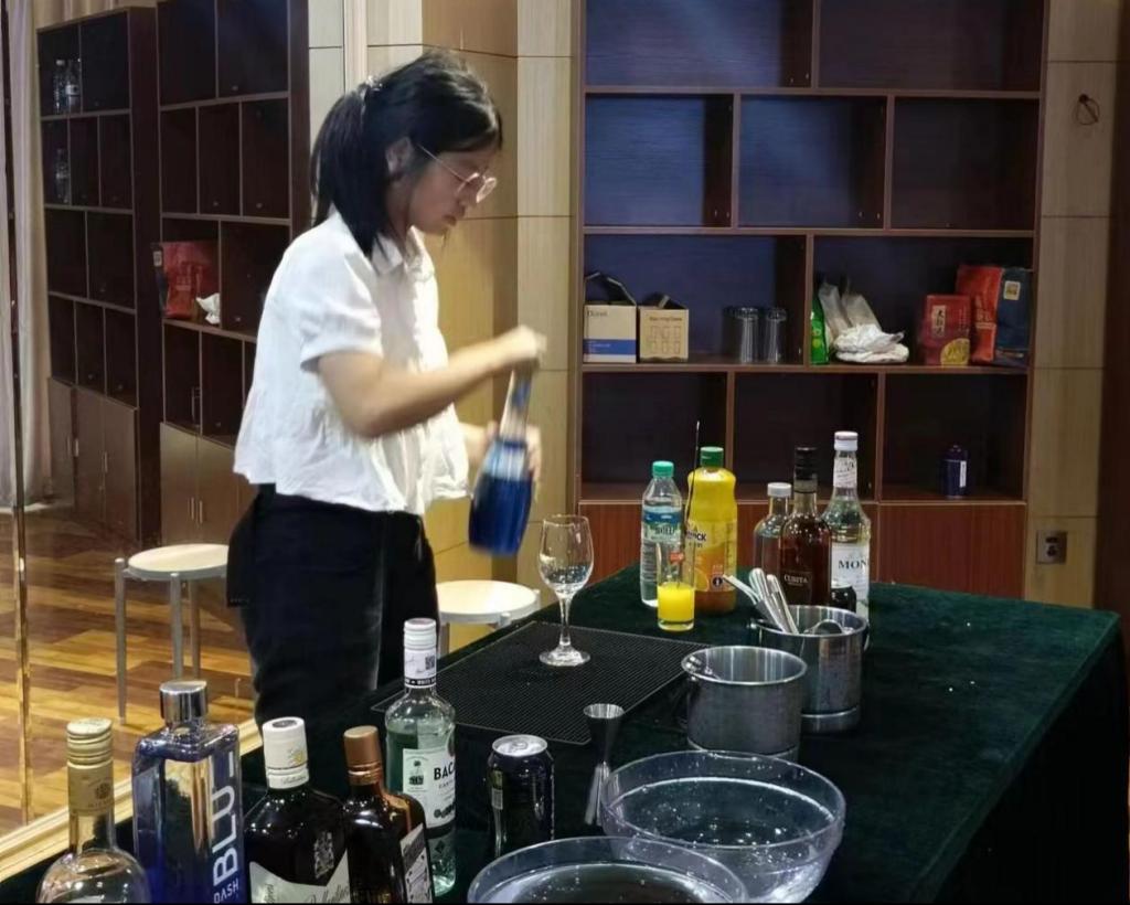 本次比赛吸引了众多来自全校不同专业的选手前来参赛。在一场鸡尾酒调制比赛中,参赛者们将在规定时间内展示他们想要制作的鸡尾酒,由评委老师通过选手调制过程中的礼仪礼貌、成品展示、调制技巧、用具使用、操作卫生和文字表述等方面进行综合评分。