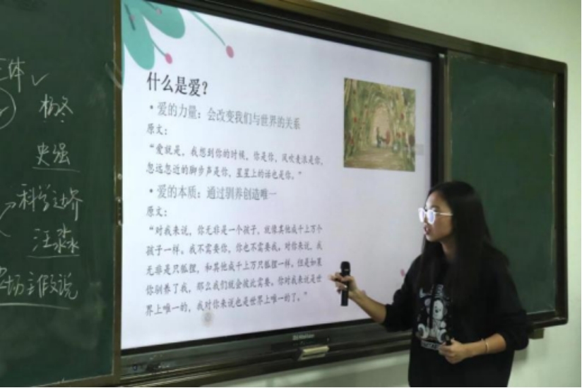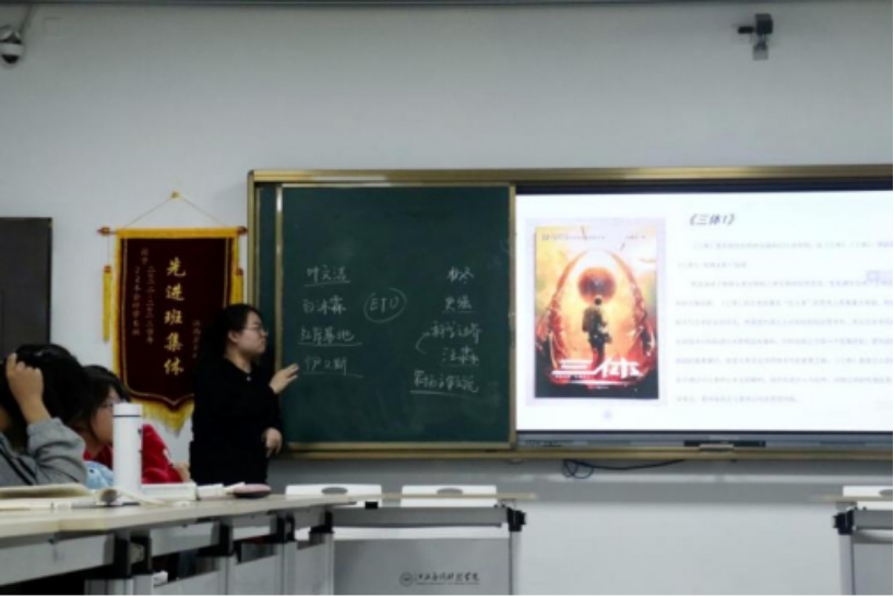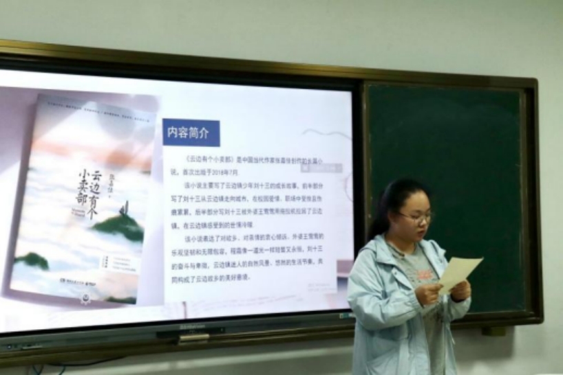 22本会计学4班童艳蕾同学向大家分享了刘慈欣的《三体Ι》,这本科幻小说最吸引人的地方在于通过对人类中心主义的解构,继而完成对人与自然、动物之间的伦理反思与文学表达,最终指向去人类中心化的思想内核。童艳蕾同学通过对主要情节的板书展示,生动形象地向大家介绍了故事的梗概,成功激发了同学们对这本书的阅读兴趣。