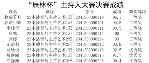 经第十四届“辰林杯”技能运动会之主持人大赛决赛评委对参赛选手进行评审打分,按成绩排名决赛的成绩公示如下: