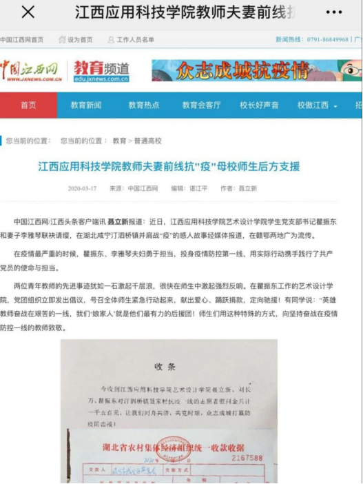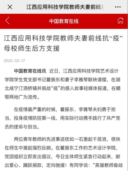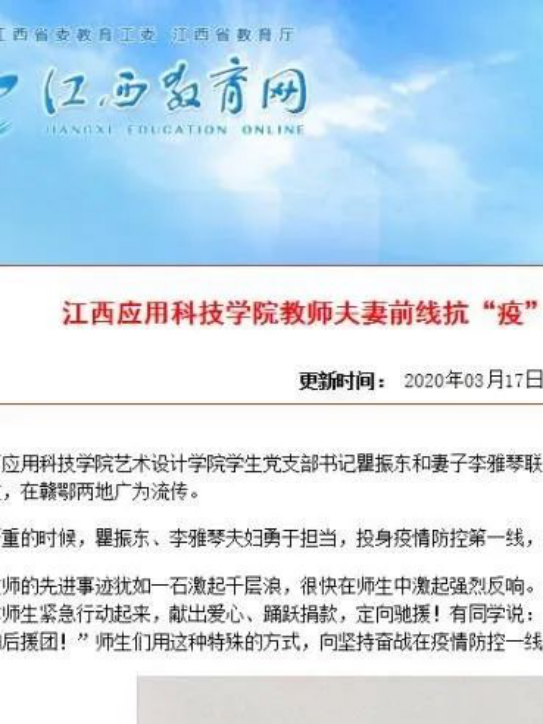 江西应用科技学院 艺术设计学院青年教师夫妻前线抗击疫情,母校师生后方进行支援这段佳话在赣鄂两地广为流传,引起媒体注意,多家主流媒体:江西教育网,中国江西网,中国教育在线等进行了播报。