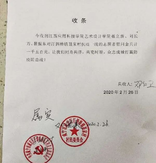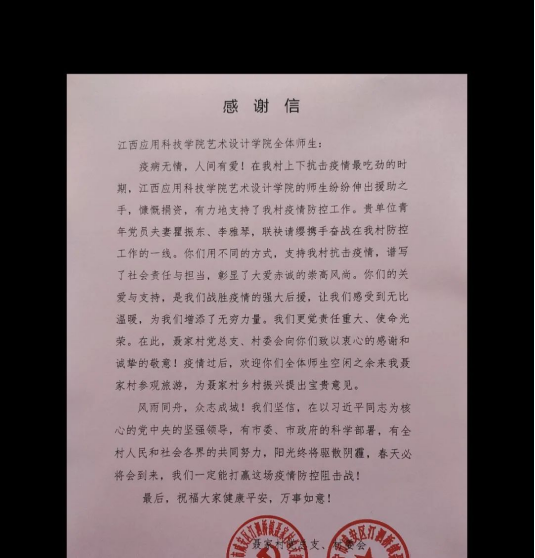 疾病无情,人间有爱!在我村上下抗击疫情最吃劲的时期,江西应用科技学院艺术设计学院的师生纷纷伸出援助之手,慷慨捐资,有力的支持了我村的疫情防控工作,贵单位青年党员夫妻瞿振东,李雅琴,请缨携手奋战在我村的防控工作一线。你们用不同的方式,支持我村的抗击疫情,谱写了社会责任与担当,彰显了大爱赤忱的崇高风尚。你们的关爱与支持,是我们战胜疫情的强大后援,让我们感受到无比温暖,为我们增添了无穷力量。我们更觉责任重大,使命光荣。在此,聂家村党总支,村委会向你们致以衷心的感谢和诚挚的敬意!!疫情后,欢迎你们来聂家村参观旅游!为聂家村振兴提出意见!