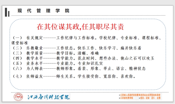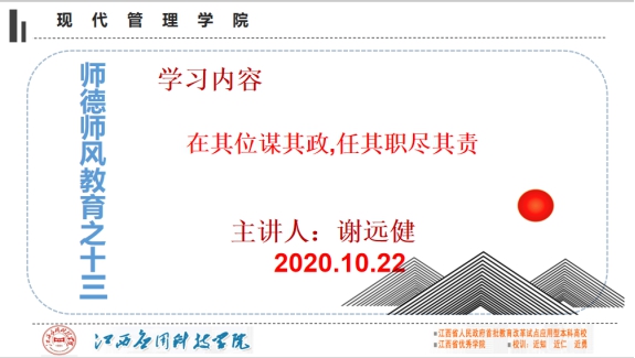 2020年10月20日下午3:30,现代管理学院在综合大楼1001党员活动室开展师德师风系列主题教育活动,本次教育活动的主题为在其位谋其政,任其职尽其责。分院全体教师参加了此次的师德师风教育学习活动,主讲人为分院院长谢远健。