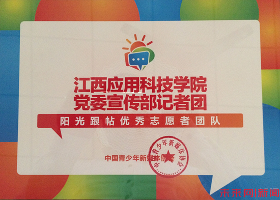 在2015年全国“阳光跟帖”系列活动中,江西应用科技学院的志愿者团队积极作为,在线上线下紧密互动,发挥了良好的作用。鉴于江西应用科技学院党委宣传部记者团在传播正能量、弘扬主旋律方面的优秀表现,江西应用科技学院党委宣传部记者团被中国青少年新媒体协会授予“优秀志愿者团队”称号,这也是江西省学生志愿者队伍中唯一一支获得该荣誉称号的高校志愿者团队。