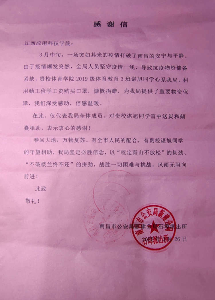 (赵新胜报道)“现在疫情防控形势又紧张了,我要报名当志愿者!请优先考虑我。”近日,南昌疫情突然袭来,全市上下众志成城、守望相助,大家共克时艰、共抗疫情,在江西应用科技学院招募疫情防控志愿者时,谌旭第一个报名,这已是他连续参加疫情防控志愿工作的第三年,这位"00后"又一次坚守在疫情防控的第一线,初心不改,奉献着自己的青春热血。谌旭是一个性格腼腆、不善言谈的小伙子,作为一名“00后”,其他人可能略显稚嫩还是一群孩子,可是在他脸上,看到的是坚定,是责任和担当。再次踏上抗“疫”征程,依旧坚定!“我有经验,我先上!”谌旭是江西应用科技学院体育学院一名大三学生,面对南昌新一轮疫情,他发挥老防疫工作者的优势,主动请战第一线。“第一次是2020年新冠肺炎疫情刚刚爆发时,第二次是2021年夏天,还有就是这次。前两次在家乡抗‘疫’积累了经验,这次我一定能守护好英雄城、守护好我们的学校。”谌旭说。在家乡,他被称为疫情防控战线的一名“老人”,每到人民群众有需要、有困难的时候,他都主动站出来,积极战斗在防疫第一线,用青春热血筑起疫情防控的安全防线。他不计报酬,辛苦付出,一个个日日夜夜坚守在一线。面对村委会工作人员发放的抗疫慰问金,他第一时间便退回了,谌旭说当了志愿者,就要有使命感,要甘于奉献,不应该收取这份慰问金,他要把这份慰问金捐给村委会,用于抗击新冠肺炎,为抗疫斗争奉献自己的一份力量。在学校,无论在教室、寝室还是体育场馆总能看到他拿着气雾喷壶以饱满的热情,细致的态度进行着消毒清杀工作的身影,核酸检测人员秩序引导、物资搬运、登记已检测信息......疫情期间,他格外地忙碌。近期,多轮核酸检测接踵而来,他在核酸检测一线,脸上多了一些憔悴。在他所负责检测楼栋下,他时刻扮演“多面手”的角色,维持现场秩序,登记检测信息,有他在;宿舍需要清洁消毒,有他在;宣传防疫知识,制作防疫图文视频,有他在……哪里有需要,他就出现在哪里。学院领导都对这个小伙子赞赏有加,夸他肯吃苦,有爱心。在他看来,即使工作再苦再累,有大家这样的肯定,就很满足。尽己所能,勤工俭学工资全数捐赠!2000只口罩哪里来的?3月26日下午,体育学院学工科副科长吕亮亮在结束核酸检测工作后进入办公室,进门便赫然发现会议桌上出现了大小5个装着防护口罩的箱子,箱子上写着“捐赠口罩共计2000只”,这2000个口罩上设计精美,都印制了logo图案,吕亮亮在箱子上没有寻找到捐赠人信息,便打电话询问各个辅导员知不知道口罩捐赠者,经过一番询问下来,也没有找到捐赠人是谁,这些天捐赠这些口罩人是谁成了学院老师“解密”游戏。一封来自派出所的感谢信,揭开了一个这样的故事......直到3月30日,江西应用科技学院收到了一封来自“南昌市公安局新建分局石埠镇派出所”的感谢信,感谢信中说到,由于疫情爆发突然,警员坚守一线,防疫物质储备不足,谌旭同学心系石埠派出所及时捐赠口罩,解决了燃眉之急,信中对体育学院谌旭同学捐赠口罩的行为进行了赞扬与肯定。结合感谢信中描写内容,和定制口罩的样式,体育学院这批口罩的捐赠人是谁的谜团也逐渐解开,谌旭也向体育学院学工科副科长吕亮亮老师坦白,吕亮亮老师恍然大悟,原来捐赠者一直在我们身边!谌旭是体育学院2019级体育教育3班的学生,作为一个体育专业生,他不仅自身专业方面发展,在新媒体这一方面也有所成就,在疫情期间,他所执笔的抗疫文章被各个媒体转发报道,用文字温暖着每一个人,这批口罩就是谌旭设计的。据了解谌旭从2021年12月份开始他便提交了勤工俭学申请,在体育学院学工科进行勤工俭学工作。面对南昌突然爆发的疫情,他不仅第一时间报名参加志愿者,还毫不犹豫地拿出了勤工俭学的工资以及平时在生活费中省吃俭用的积蓄用于购买口罩。“由于疫情爆发突然,学校封闭管理,很多师生的口罩都没有准备充足,我便萌生了捐赠口罩的想法。”谌旭说。疫情期间,南昌很多地方都实行了封闭管理,导致快递停运,谌旭经过多番联系沟通,才凑足了2000个口罩。“其实刚有这个想法时没有告诉父母,我怕疫情期间口罩运送不到,导致捐赠失败,直到口罩运送到了我才放心告诉他们”谌旭说。谌旭父母当时知道这个事情的时候非常感动,很认可支持他捐赠口罩的做法,并鼓励他要勇于担责,多做贡献,明确自己的政治身份,用自己的行动回报学校、回报社会。“我觉得我们应该时时刻刻保持着一颗赤子之心,需要的时候就站出来,在保证安全的情况下,尽己所能的发光发热。我的能力虽然有限,但能为这次疫情做出一些贡献,我觉得很有意义。”谌旭说。