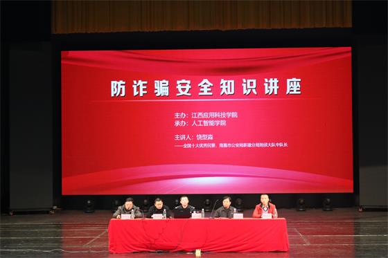 本网讯(记者团记者/李颖、萧春萌、张宏 摄影/李欣铮、钱禧)12月21日,由我校主办,人工智能学院承办的“防诈骗”安全知识讲座在我校音乐厅成功举办,江西省南昌市公安局新建分局刑侦大队情报中队中队长饶型淼,南昌市公安局新建分局石埠派出所熊国坚所长出席讲座,我校副校长吴朝栋,人工智能学院党总支书记樊立君及千余名学生代表聆听了此次讲座,讲座由保卫处处长宋春雷主持。
