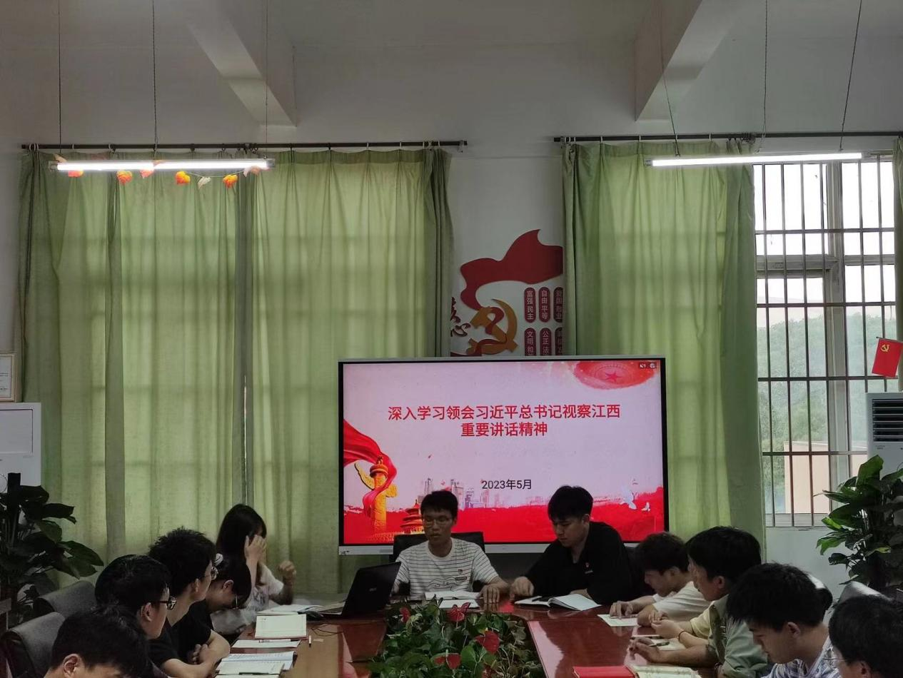 在习近平总书记视察江西四周年之际,为更加深入的学习领会习近平总书记视察江西重要讲话精神,践行习近平新时代中国特色社会主义思想主题教育,动员全体同志感恩奋进、接续奋斗,全力践行“作示范、勇争先”的殷殷嘱托。2023年5月15日软件与区块链学院学生党支部在210党员活动室召开了“深入学习领会习近平总书记视察江西重要讲话精神”专题学习,参会人员为软件与区块链学院学生党支部书记曾不亚,学生党支部组织委员王紫依,学生党支部宣传委员何锦以及全体党员同志。